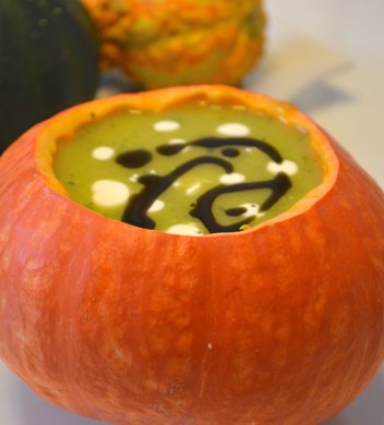 Fate soffriggere il porro con un po’ di burro allo yogurt. Aggiungete la zucca tagliate a fette e le patate tagliate a dadini. Aggiungete circa 8 dl di acqua. A piacere aggiungete un dado di brodo vegetale o spezie fresche o secche. Cuocete per 20-25 minuti. Infine mescolate con un mixer e condite con sale e pepe a piacere. Aggiungete mezzo decilitro di panna da cucina e scaldate di nuovo il tutto fino ad ebollizione. Aggiungete a crudo l’olio di zucca ed i semi di zucca come decorazione.